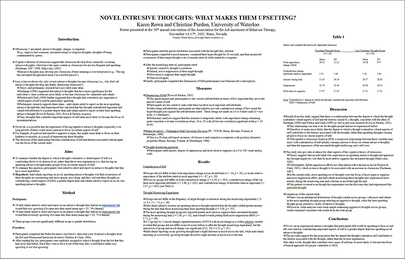 Presenting one’s research at a conference is a staple of knowledge translation. Two of the authors (KR and NJ) have been privileged to serve as poster judges in a variety of contexts over the course of our multi-decade careers. We were recently judges at a national conference. Over coffee, we started talking about the characteristics of a compelling, interesting, and well-communicated poster. We realized that the existing guidance documents don’t fully capture our experience of being drawn to some posters over others. We decided to create an example that will hopefully provide some guidance for interested readers. The exercise and our reflections are presented in this article.