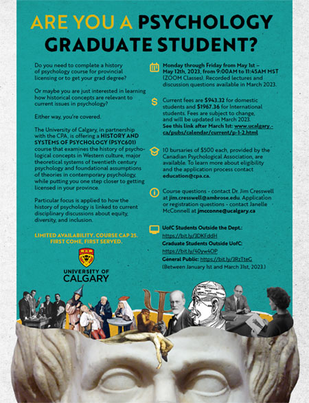 The University of Calgary, in partnership with CPA, is offering a HISTORY AND SYSTEMS OF PSYCHOLOGY (PSYC601) course that examines the history of psychological concepts in Western culture, major theoretical systems of twentieth century psychology and foundational assumptions of theories in contemporary psychology while putting you one step closer to getting licensed in your province. Particular focus is applied to how the history of psychology is linked to current disciplinary discussions about equity, diversity, and inclusion.