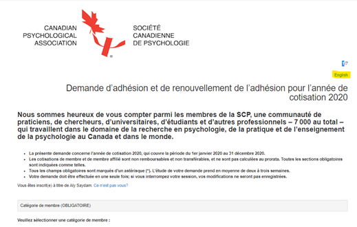 - Vous pouvez passer au formulaire en anglais en sélectionnant « English » dans le coin supérieur droit.